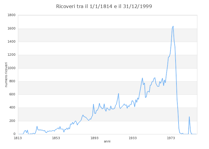 Curva annuale dei ricoveri Durata dei ricoveri Età al primo ricovero Provincia di nascita Provincia di residenza Termine del ricovero Istruzione Condizione economica Stato civile Mestiere/professione Religione